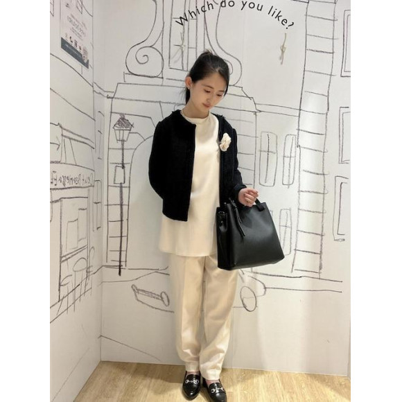 뒤에 개저가 새겨진 뒷모습이 화려한 블라우스에 포켓 부분의 펄이 화려한 팬츠를 맞춘 셋업 코데입니다*